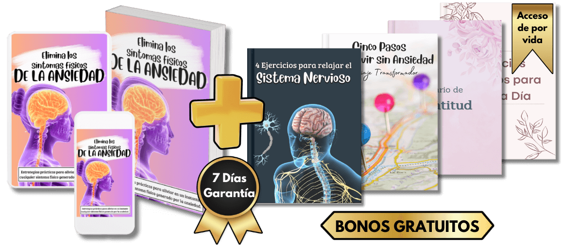 Por este motivo he plasmado esta Técnica Exclusiva de 4 pasos en mi libro digital «Elimina los Síntomas Físicos de la Ansiedad», el cual está diseñado para proporcionarte las herramientas y estrategias prácticas que necesitas para enfrentar y superar los síntomas físicos de la ansiedad de una vez por todas, sin importar la gravedad actual de los mismos.